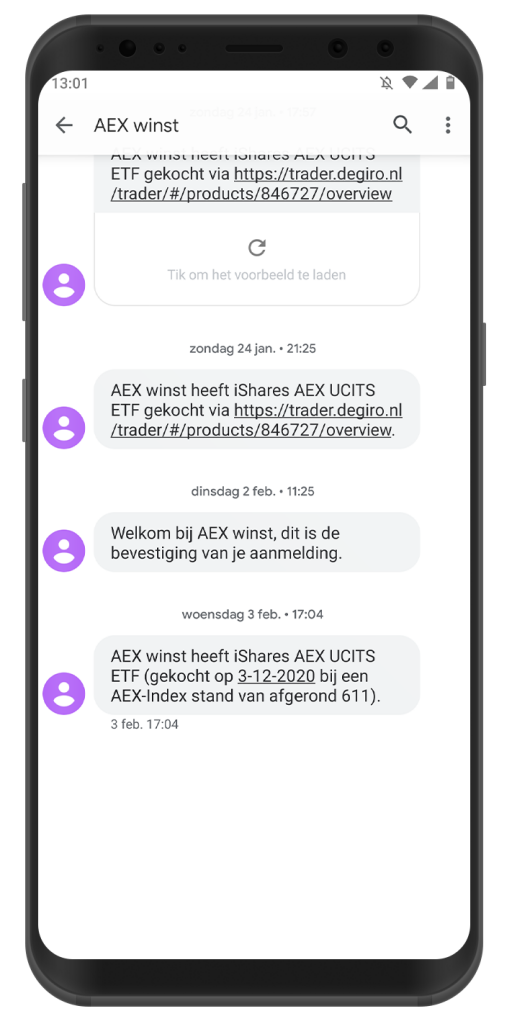 Schrijf je hier gratis* en vrijblijvend in en ontvang de actuele SMS-berichten met de aankoop- en verkooptransacties. Je ontvangt dan ook de maandelijkse nieuwsbrief van AEX winst met meer informatie over beleggen.